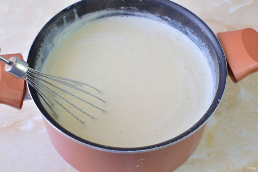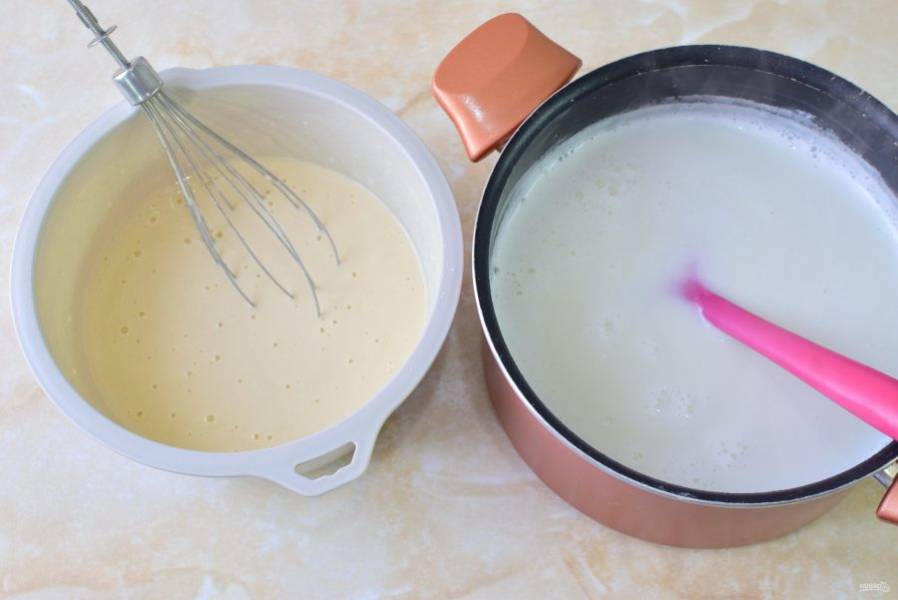 Когда молоко закипит, вливайте его в яичную массу, постоянно помешивая.