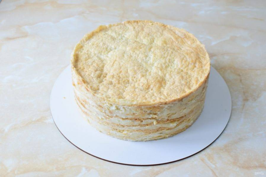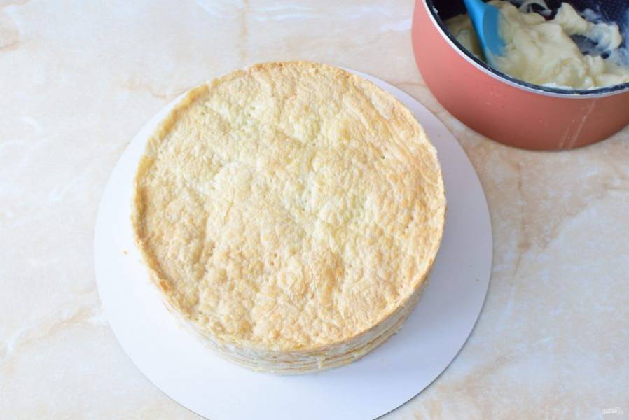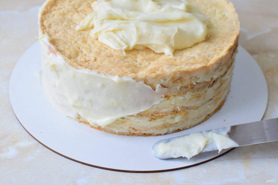Промазывайте коржи на наполеон. Немного крема оставьте для внешней обмазки торта.