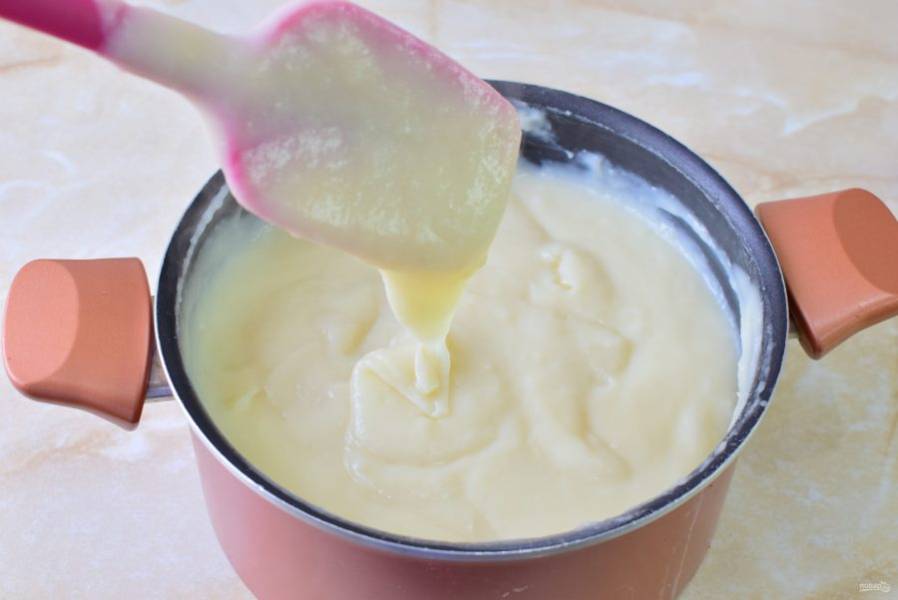 Когда крем растает, смешайте все ингредиенты миксером. Однородный крем накройте пленкой и оставьте остывать.