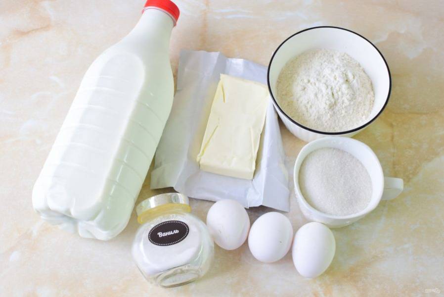 Для приготовления заварного крема подготовьте необходимые ингредиенты. Муку просейте через сито.