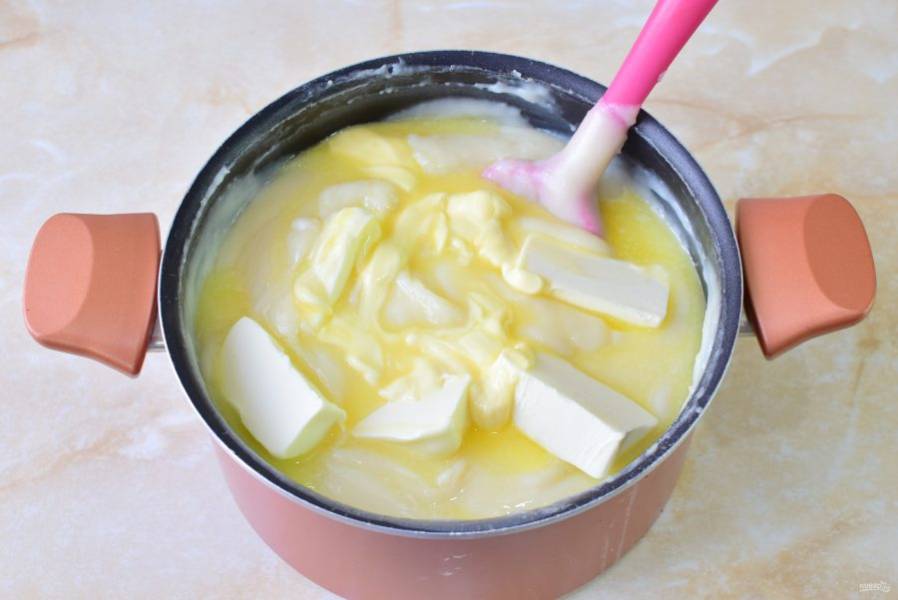 В горячий крем добавьте сливочное масло. Оно сразу будет таять.