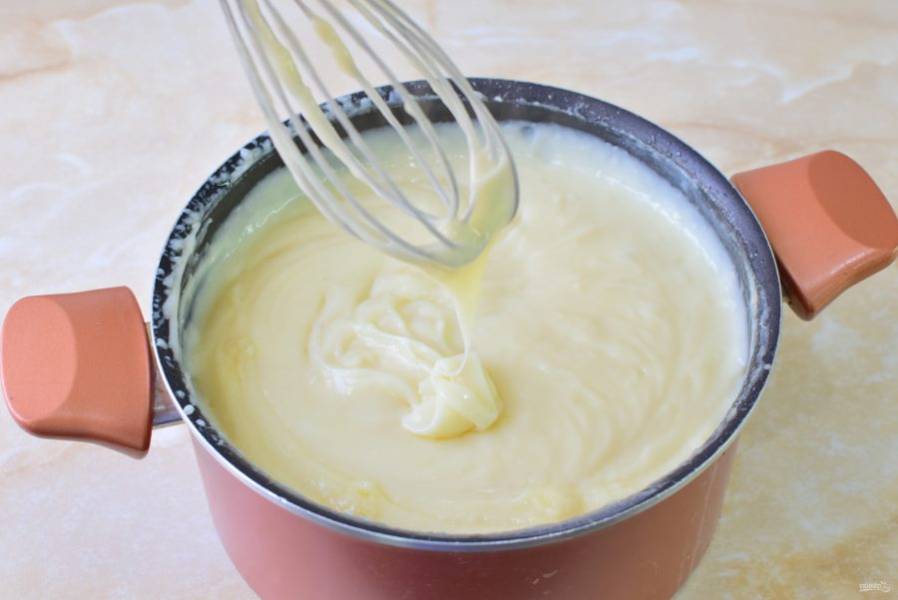 Нежный, легкий и вкусный крем. Он отлично пропитывает коржи для торта "Наполеон", приготовленные из слоеного теста. Крем можно использовать для приготовления пирожных или просто в качестве десерта.