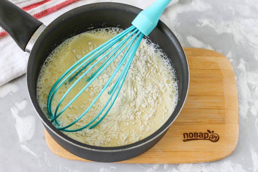 Влейте молоко и тщательно взбейте содержимое ковша венчиком, проводя по дну и приподнимая желтковую массу. Всыпьте пшеничную муку и еще раз все хорошенько взбейте, чтобы не образовались комочки. Муку добавляйте только в холодную массу - молоко должно быть охлажденным, иначе она вбьется комками.