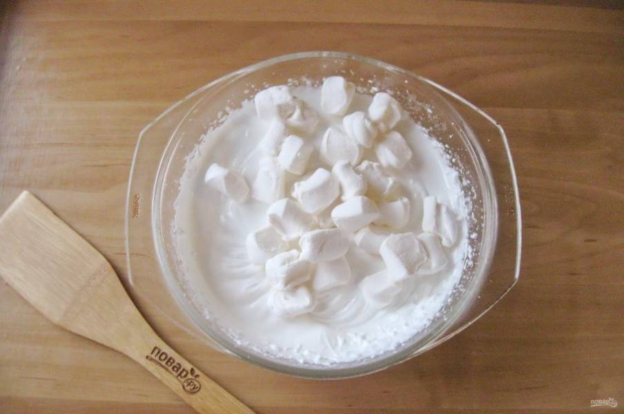 Маршмеллоу нарежьте и выложите в белковую смесь. Миска находится на водяной бане. Перемешивайте пока маршмеллоу полностью не растворится.