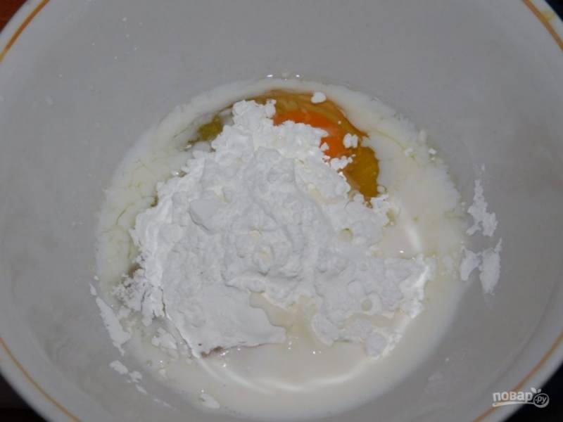 Смешайте в одной чаше яйца, крахмал, ванилин и немого молока.