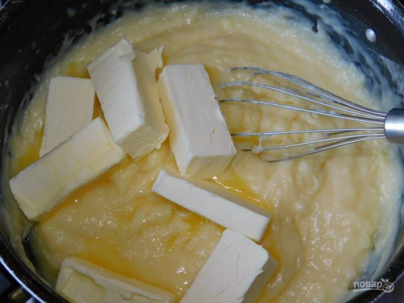Добавьте сливочное масло. Перемешайте, чтобы оно растаяло. Готовый крем охладите.