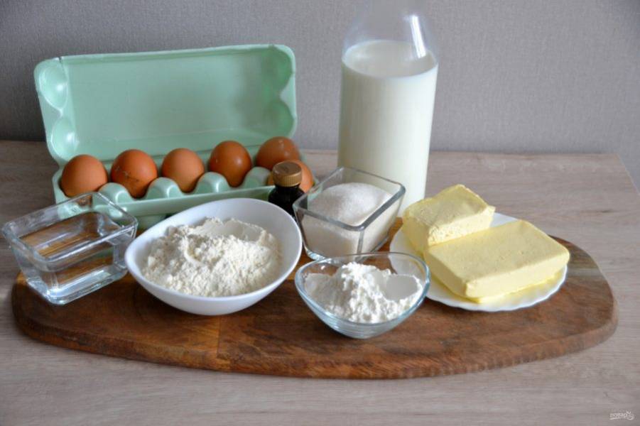- Яйцо 6 штук 2 яйца — в крем, 4 яйца — в тесто для эклеров