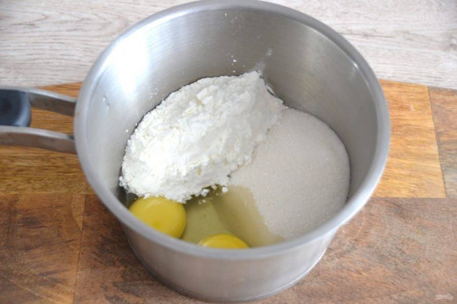 Начните приготовление эклеров с приготовления крема. Для этого выложите в сотейник 2 яйца, 150 грамм сахара, кукурузный крахмал, смешайте.