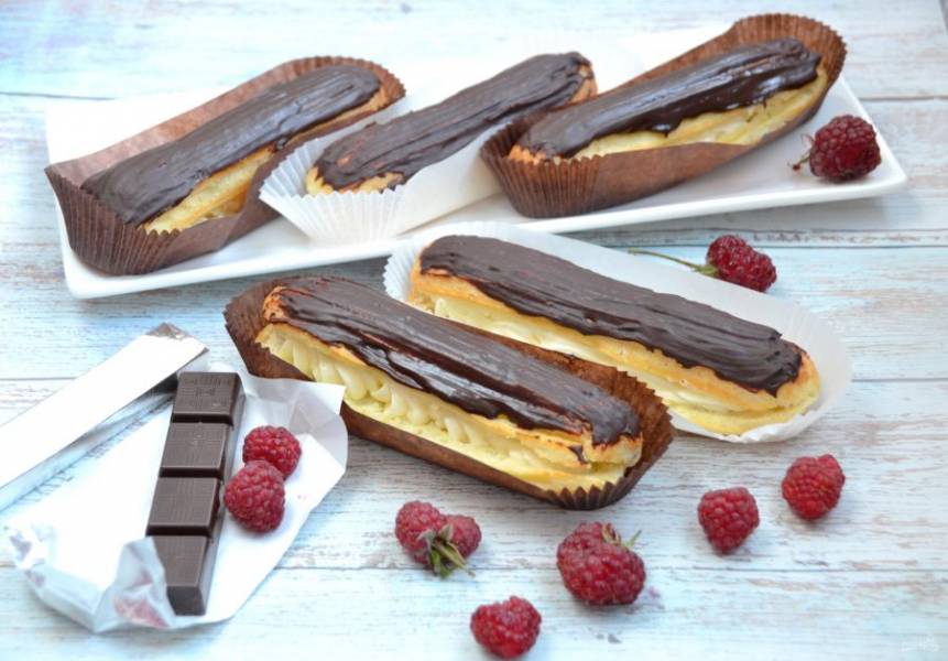 Выпекайте эклеры при температуре 190 градусов 30-35 минут, далее понизьте температуру до 160 градусов и выпекайте еще 10 минут. Готовые эклеры не торопитесь доставать из духовки, приоткройте дверцу и подержите минут 10, чтобы они не опали из-за разницы температуры.
