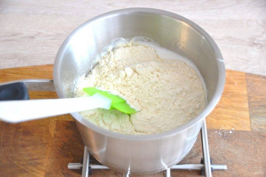 Всыпьте в сотейник разом всю муку, интенсивно размешайте.