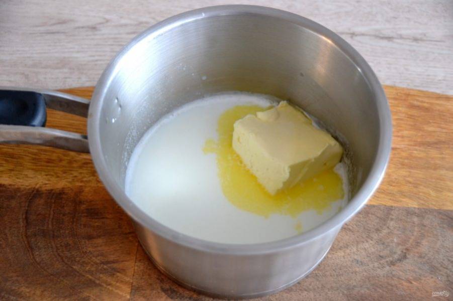 Для приготовления теста для эклеров влейте в сотейник молоко 125 мл., воду 125 мл., нагрейте до закипания, добавьте сливочное масло (100 грамм).