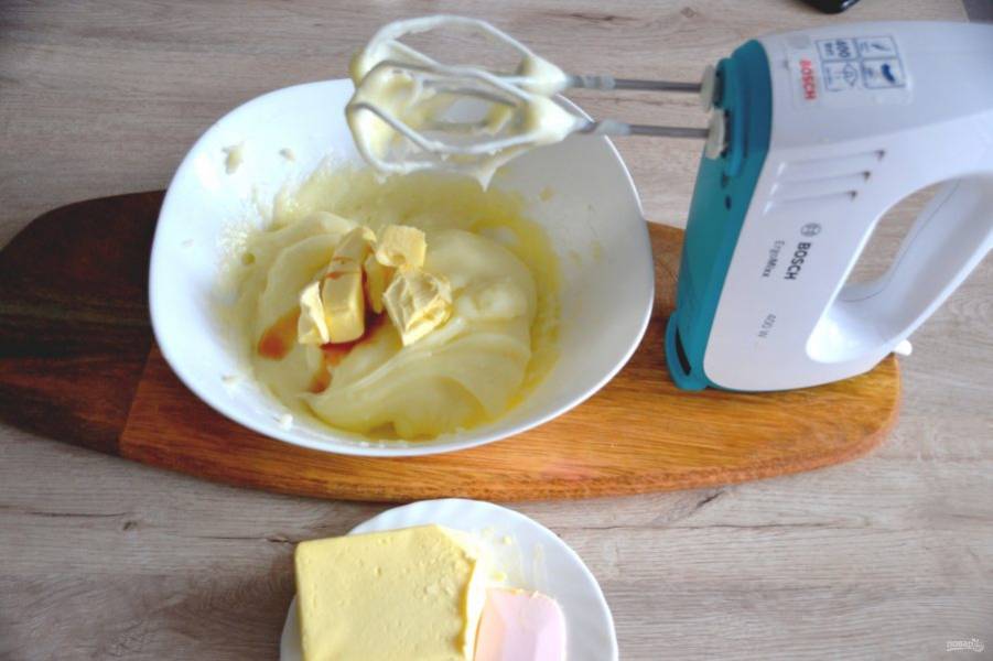 Добавьте в крем экстракт ванили, частями добавьте мягкое сливочное масло комнатной температуры. Чтобы крем хорошо смешался, заварная часть крема и сливочное масло должны быть одинаковой комнатной температуры.
