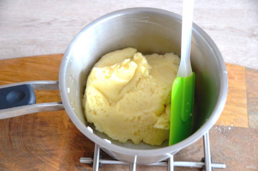 Как только тесто соберется в комок и отойдет от стенок сотейника, снимите с огня, немного остудите.