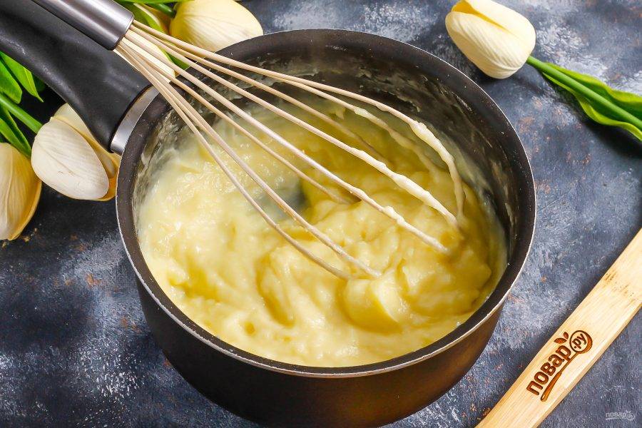 Поместите емкость на плиту, включая умеренный нагрев. Непрерывно помешивая, доведите всю массу до загустения в течение 7-10 минут. Крем непременно заварится, если у вас все продукты надлежащего качества. Если крем свернется в творожистую массу, то дело в сметане! Снимите емкость с огня и накройте крем пищевой пленкой стык в стык, вынесите на холод примерно на 30 минут.