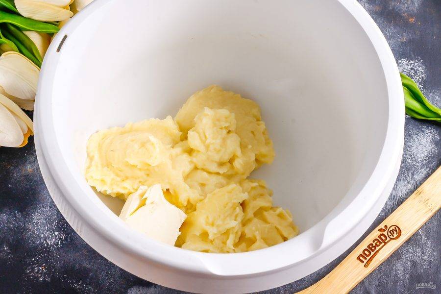 После охлаждения соедините в чаше кухонного комбайна или миксера сливочное масло и крем, тщательно взбейте.
