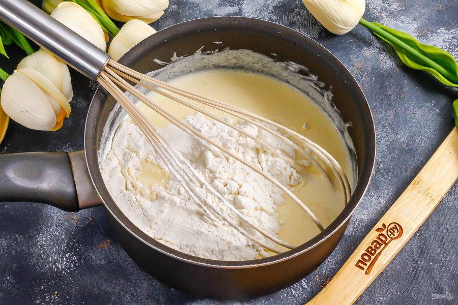 Взбейте все содержимое емкости и всыпьте просеянную пшеничную муку. Вмешайте ее неторопливыми движениями.