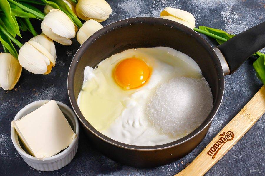 В емкости с антипригарным дном соедините сметану, сахар, лимонный сок. Вбейте туда же куриное яйцо.