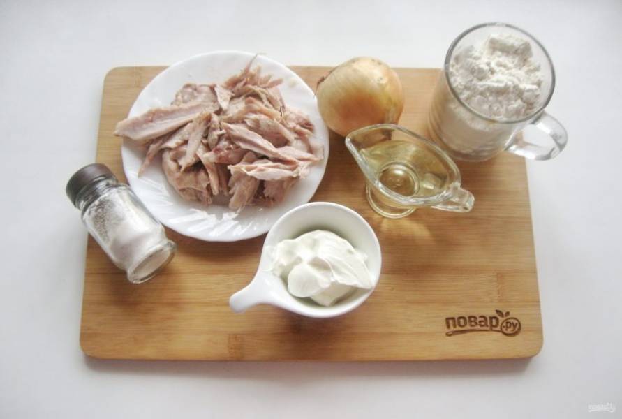 Пока тесто отдыхает, сделайте начинку для креплах. Отварное мясо измельчите.