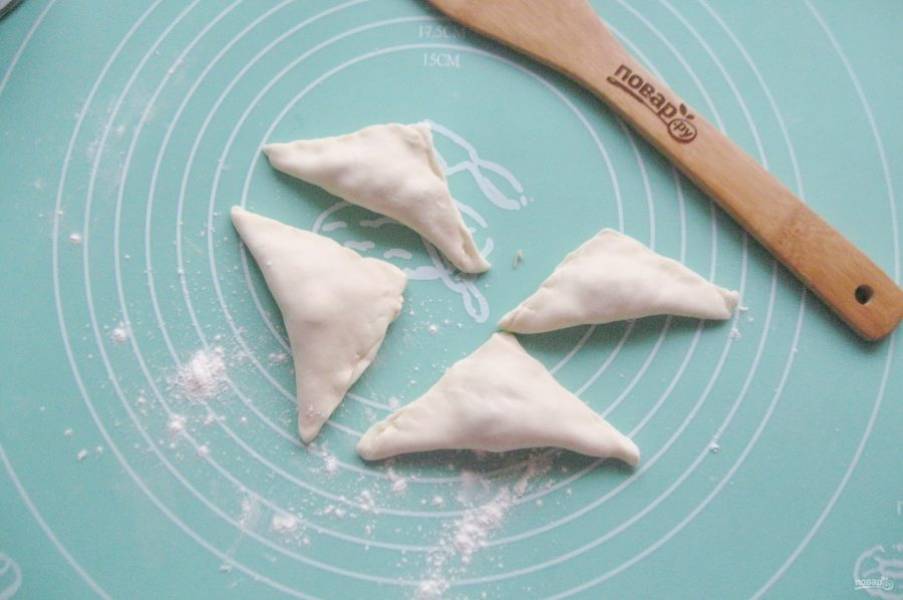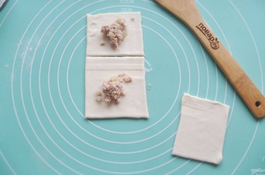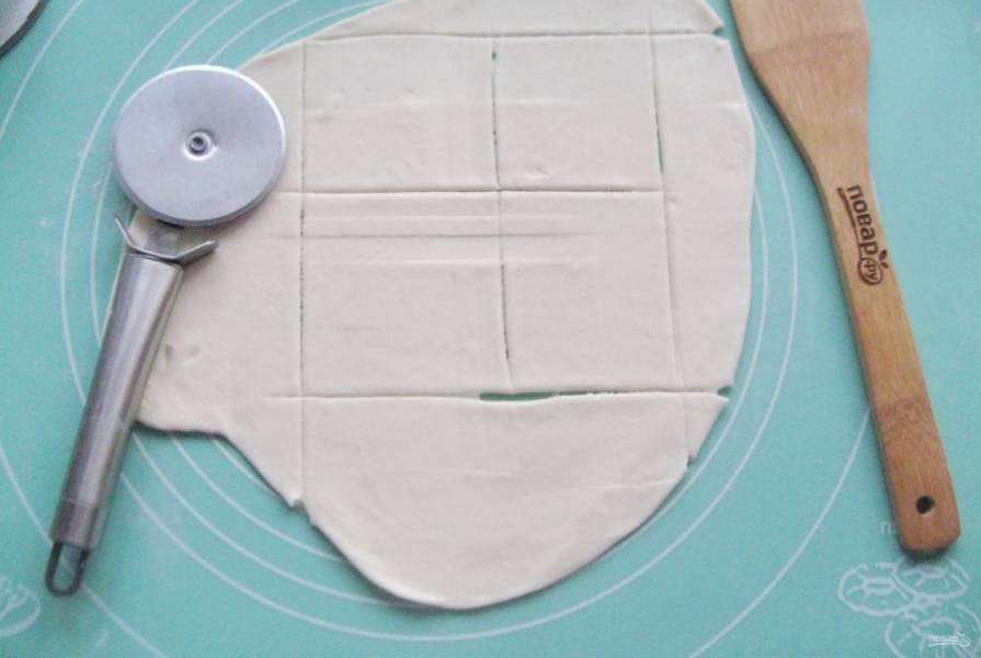 Тесто раскатайте в тонкий пласт, как на обычные вареники. С помощью ножа и линейки нарежьте тесто на квадраты со стороной 6-7 сантиметров.