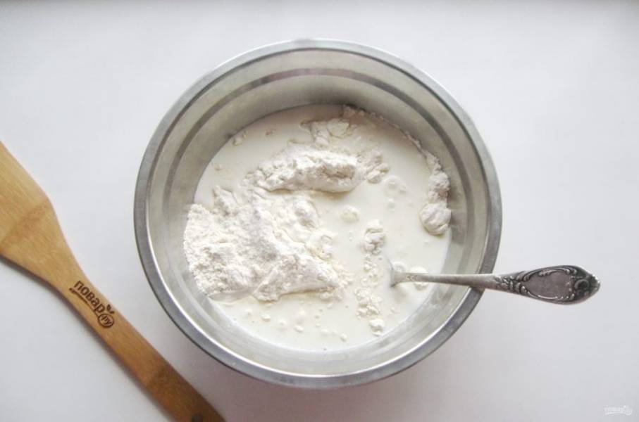 Сметану смешайте с теплой водой и влейте в муку с солью.