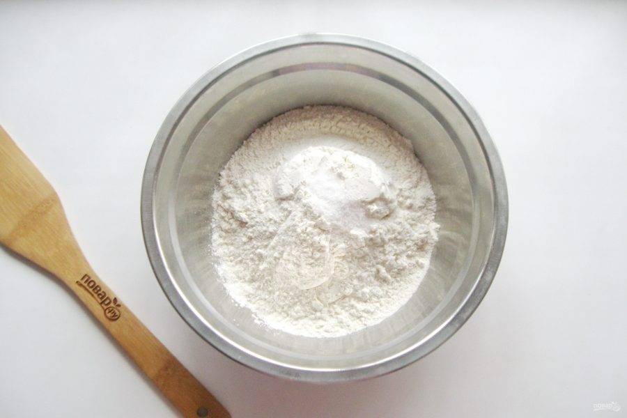 Приготовьте тесто. В миску насыпьте муку и соль.