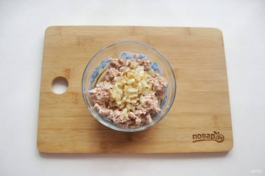 Лук мелко нарежьте и поджарьте в масле до золотистого цвета. Добавьте в молотое мясо.
