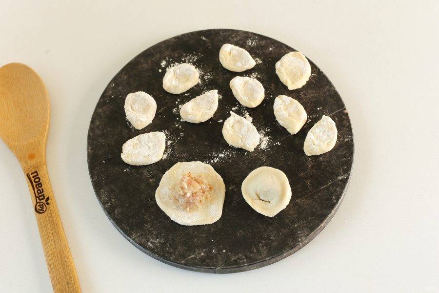 От теста отрежьте кусок и раскатайте его колбаской. Затем нарежьте маленькими кусочками, а каждый кусочек обваляйте в муке и раскатайте в форме круга. Выложите в центр начинку и сформируйте пельмень.