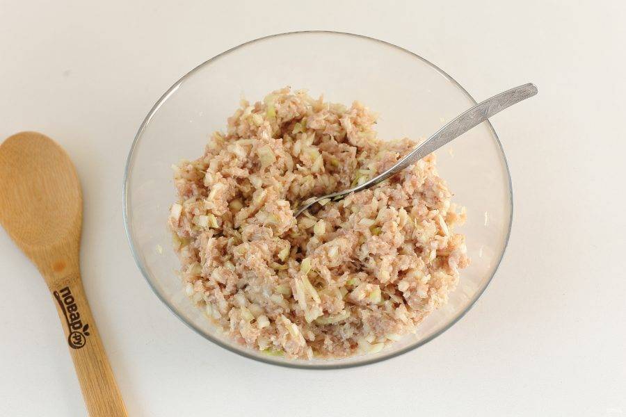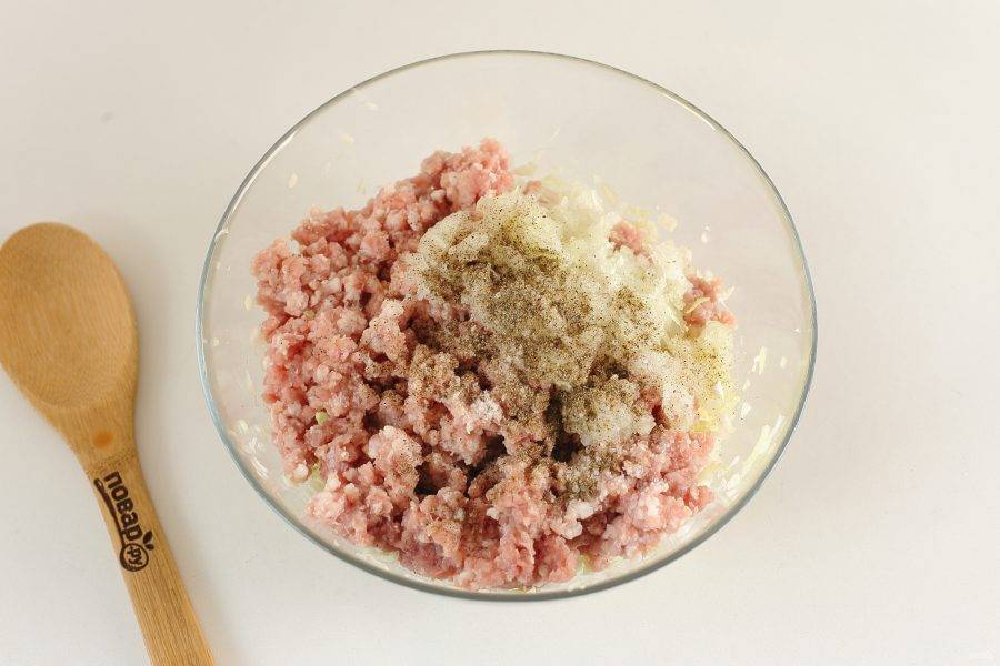 Добавьте к капусте фарш, соль и специи по вкусу. Можно добавить чеснок и рубленую зелень.