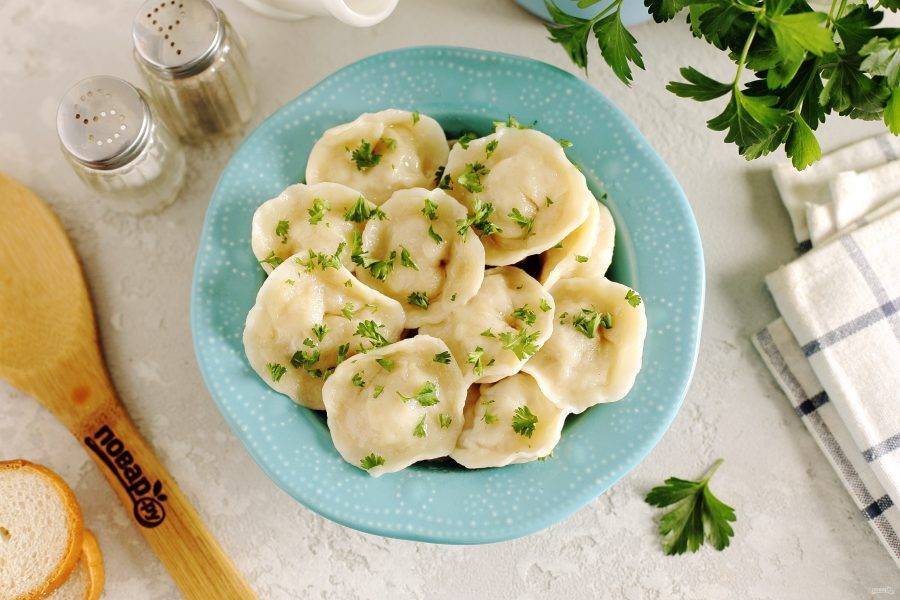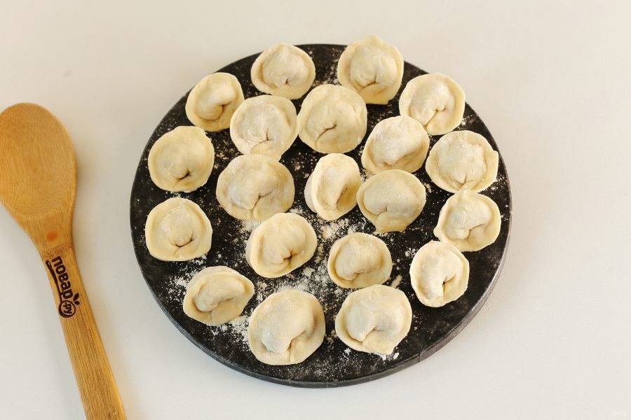 Таким образом приготовьте все пельмени. Часть пельменей можно заморозить, а часть отварить. Варите пельмени в подсоленной воде после всплытия около 2-3 минут.