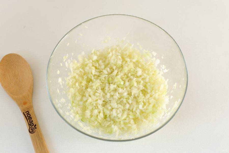Капусту измельчите при помощи блендера или мелко порубите ножом. Затем добавьте к капусте щепотку соли и хорошо помните руками, чтобы она стала мягче. Можно измельчить капусту при помощи мясорубки.