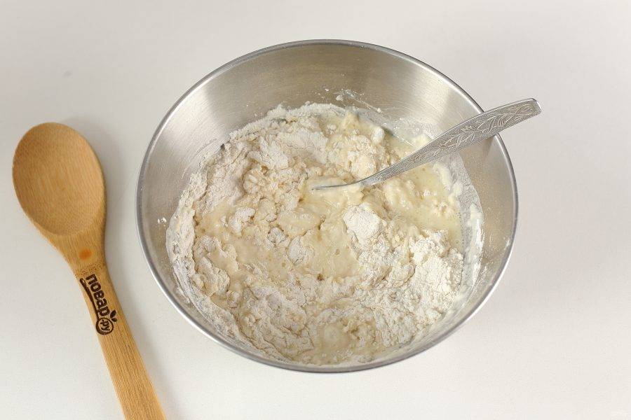 Соедините воду, яйцо и масло. Добавьте 0,5 ч.л. соли и перемешайте. Затем частями добавьте муку.