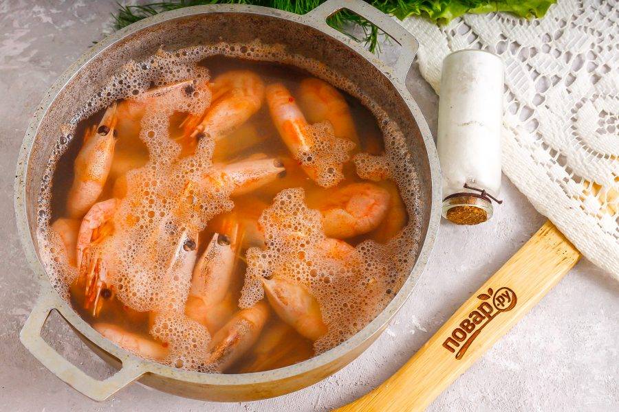 Отварите розовые креветки примерно 1-2 минуты, а серые — 5-7 минут. Розовые нужно просто прогреть, а серые именно отварить до готовности.