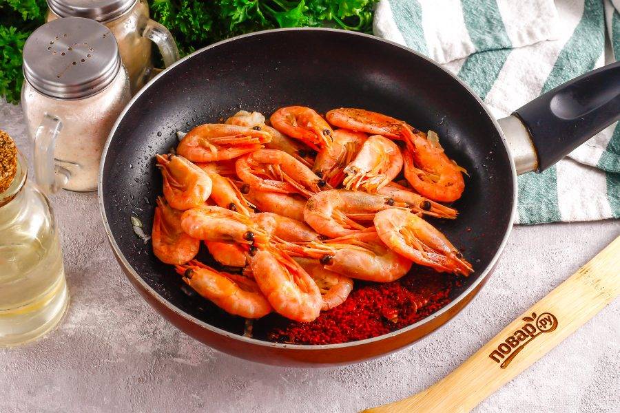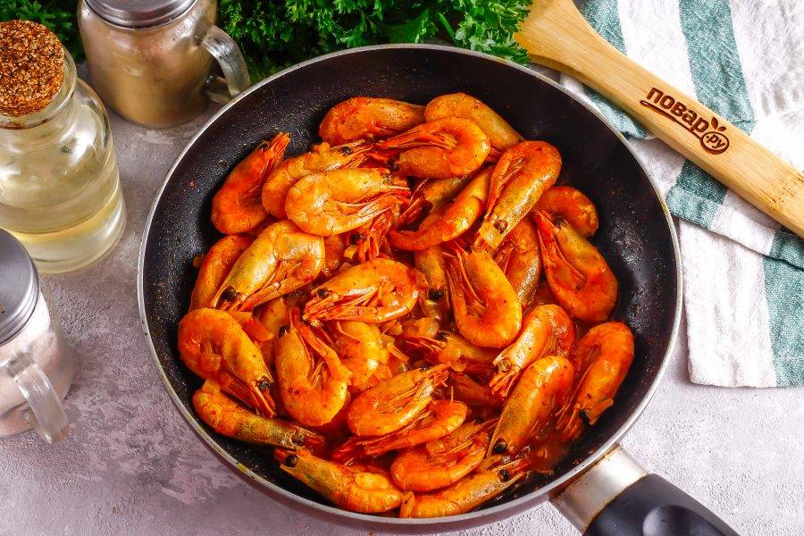 Высыпьте в сковороду креветки и перемешайте их. Томите примерно 5-7 минут, убавив нагрев до умеренного.