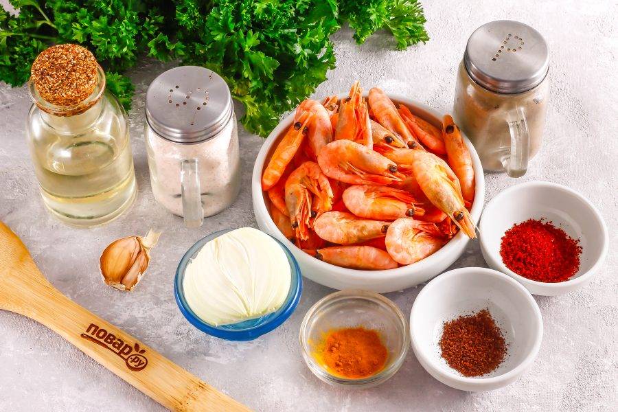 Подготовьте указанные ингредиенты. Разморозьте креветки. Если продукт приобретался свежемороженный, то его необходимо тушить около 8-10 минут, если варено-мороженый, то около 3-4 минут.
