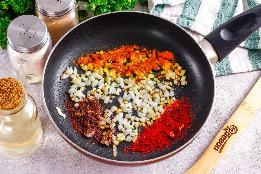 Очистите луковицу и чеснок от шелухи, промойте в воде. Нарежьте половину луковицы мелким кубиком, чеснок — спрессуйте или измельчите. Высыпьте обе нарезки на сковороду, влив на нее растительное масло. Обжарьте примерно 2-3 минуты.