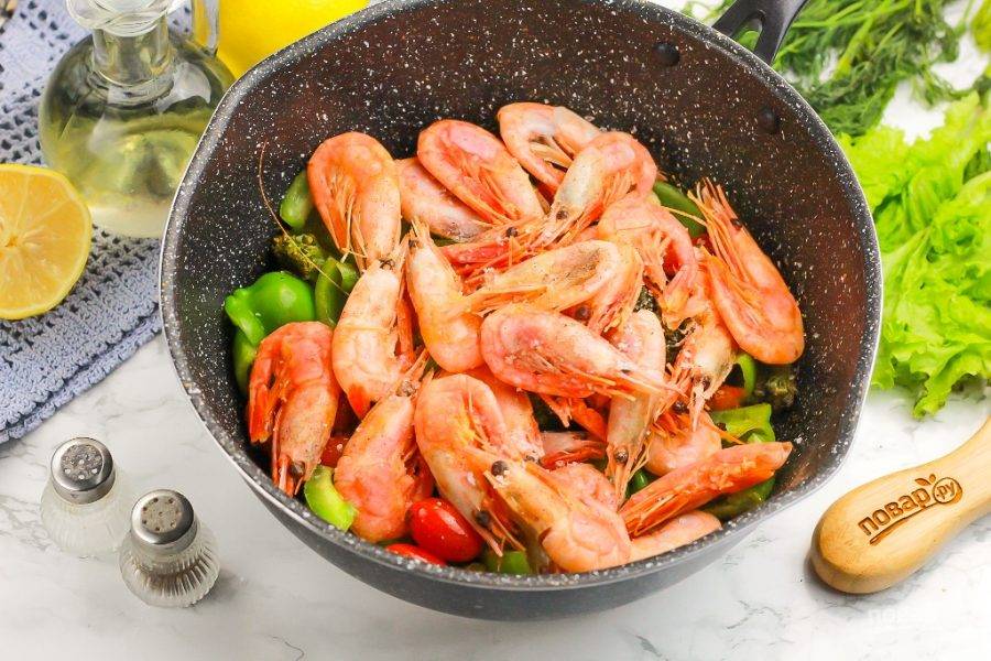 Томите все в течение 15 минут на среднем нагреве, помешивая содержимое емкости каждые 3 минуты. Креветки и овощи выпустят сок и потушатся в нем — в собственном соку, перемешивая ароматы и вкусы.