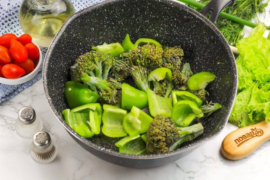 Перцы очистите от семян, срезав крышечки, а соцветия брокколи разрежьте на меньшие. Перец нарежьте порционными кусочками, но не мельчите. Прогрейте в казане, сотейнике или сковороде с антипригарным дном растительное масло и выложите овощные нарезки.