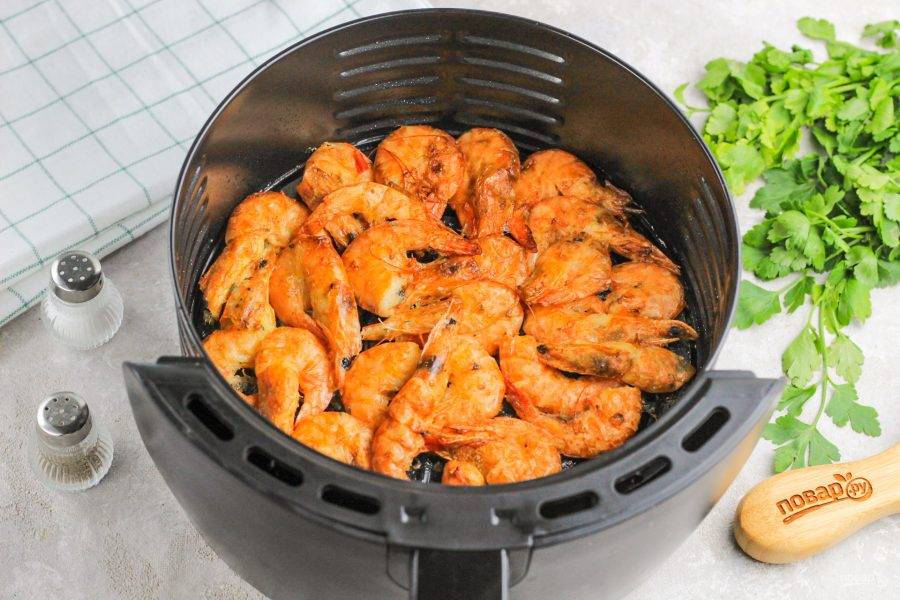 Активируйте на таймере 15 минут при температуре 160 градусов и поместите чашу в технику. Если у вас в наличии крупные креветки, то добавьте еще 5 минут для их запекания.
