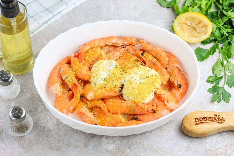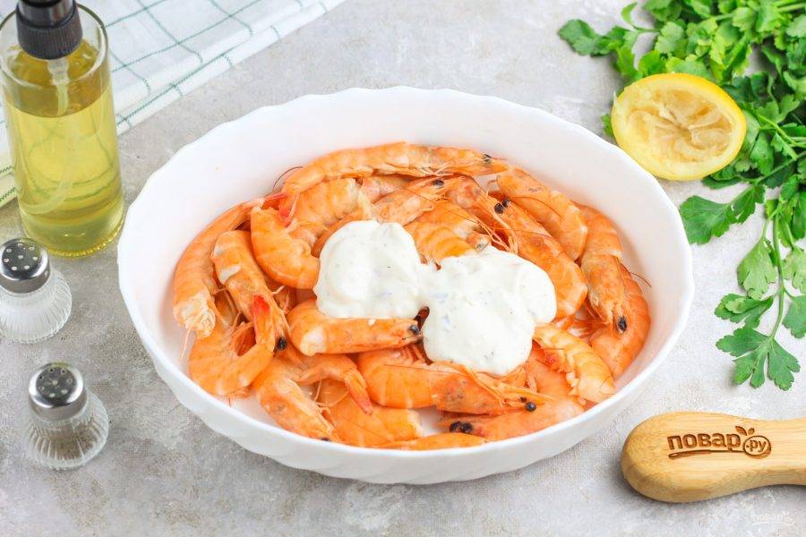 Креветки промойте в воде, подсушите бумажными салфетками и выложите в глубокую емкость. Выложите сметану любой жирности. Можно вместо нее использовать любой соус на белой основе, например — чесночный.