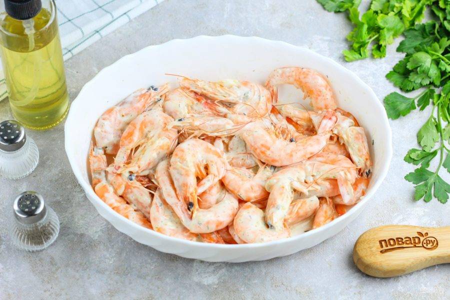 Тщательно все перемешайте и оставьте креветки в соусе минимум на полчаса. Лучше всего мариновать их 1-2 часа при комнатной температуре.