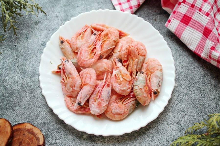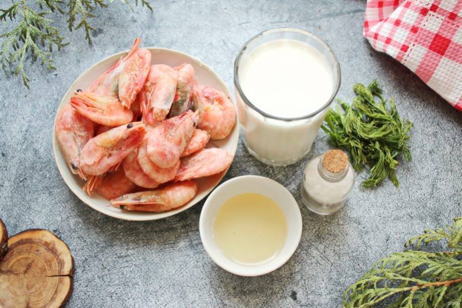 Подготовьте все необходимые ингредиенты для приготовления креветок в молоке.