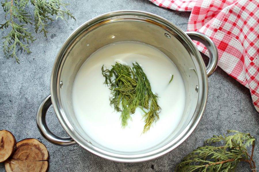 В кастрюлю с толстым дном налейте воду и молоко, доведите до кипения на среднем огне. Все посолите и добавьте укроп. Доведите снова до кипения.