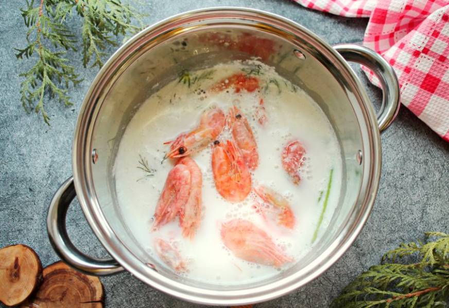 Выложите в кастрюлю креветки и варите в течение 3 минут после закипания.