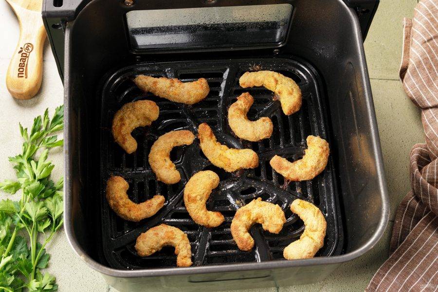 Выложите креветки в чашу аэрогриля, предварительно смазанную маслом. Сверху креветки так же сбрызните маслом и готовьте при температуре 170 градусов 5 минут.