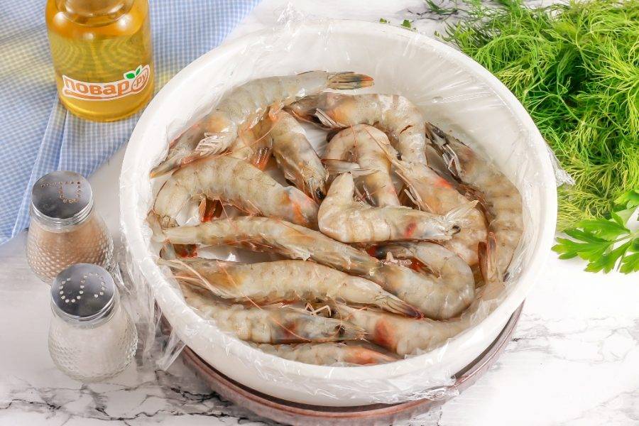 Промойте креветки и разморозьте, если приобретали замороженные. Застелите пищевой пленкой емкость для приготовления на пару и выложите в нее креветки.