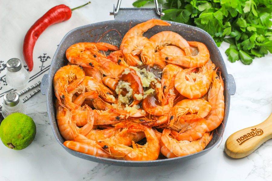Креветки обязательно разморозьте и промойте в воде. Тщательно стряхните с морепродуктов лишнюю влагу. Прогрейте в сковороде растительное масло и выложите в него креветки. Обжарьте примерно 3-5 минут в зависимости от их величины.