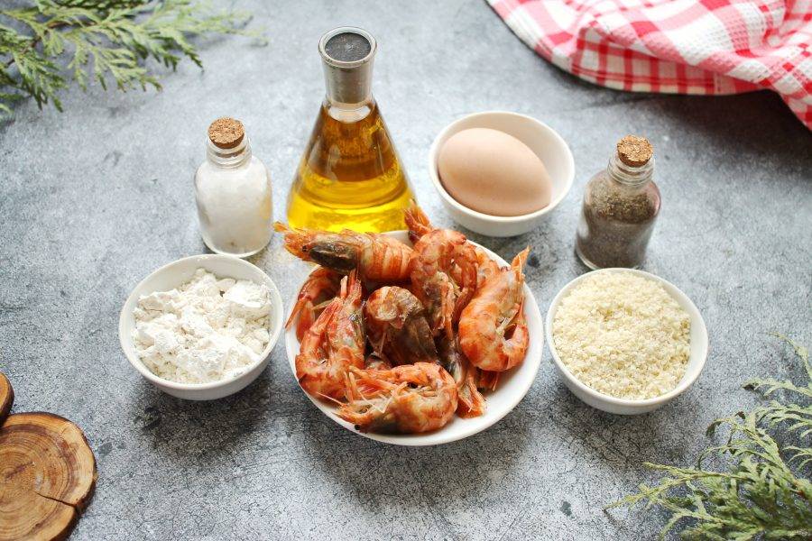 Подготовьте все необходимые ингредиенты для приготовления креветок в сухарях панко.