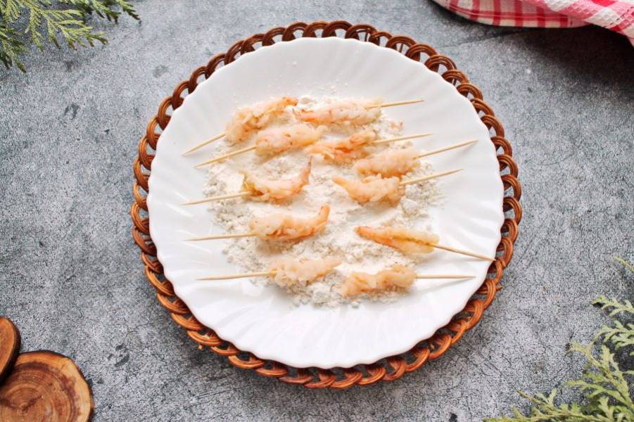 Муку посолите и полностью обваляйте в ней креветки.