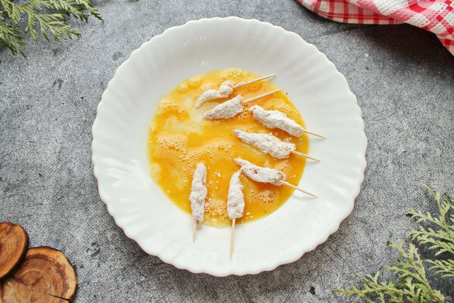 Яйцо разбейте в миску, поперчите и перемешайте до однородности. Покройте полностью каждую креветку яйцом.