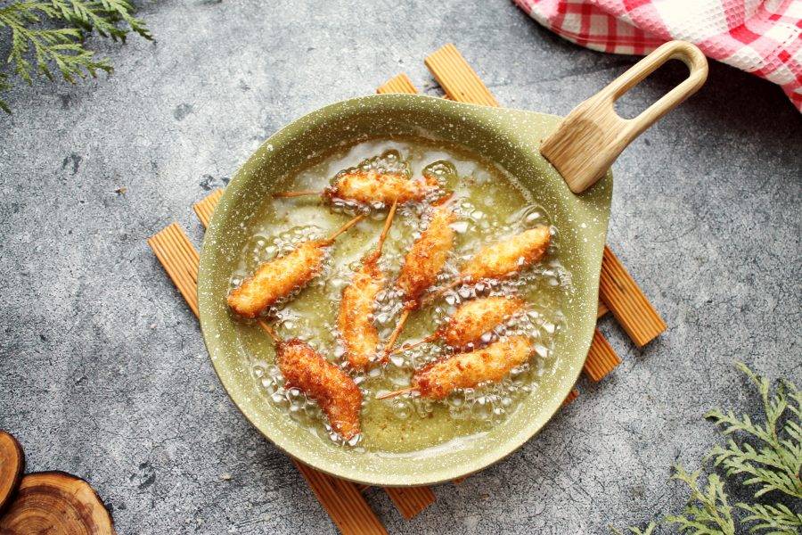 Полностью запанируйте креветки в сухарях и дайте полежать 5 минут.